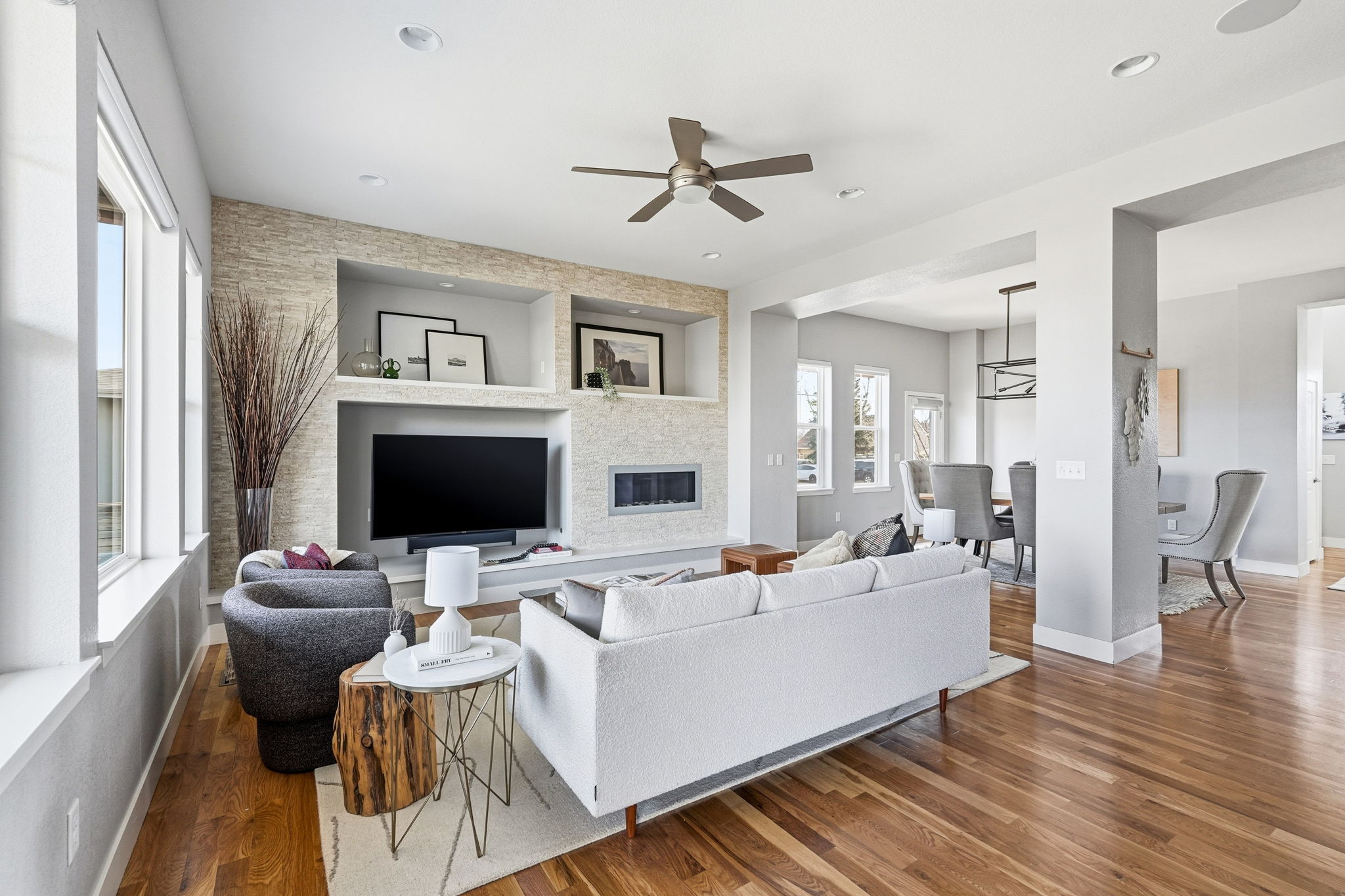 On the main level, an open-concept layout centers around a chef’s kitchen with Verona gas range, professional refrigerator, Bosch dishwasher, and dual pantries, flowing naturally into warm living and dining spaces anchored by a cozy gas fireplace. A main-floor office or guest room with adjacent ¾ bath adds everyday flexibility, while upstairs bedrooms and a spa-like primary suite provide peaceful places to unwind at day’s end.